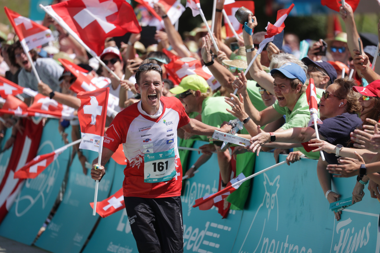 Nach einem Ruhetag ging es an der OL-WM 2023 in Flims Laax am Samstag mit dem Mitteldistanz-Final weiter. Das Gelände im Flimser Bergsturz mit vielen komplexen Geländedetails und Felsformationen erforderte genaues Kartenlesen vom Anfang bis zum Ende. Vielen – auch Anwärter*innen auf die Medaillen – unterliefen dabei zeitraubende Fehler. Ohne Fehler durchgekommen ist hingegen Matthias Kyburz, welcher bei jeder Zwischenzeit Bestzeit lief und vor Tausenden Schweizer Fans seinen WM-Titel in der Mitteldistanz verteidigte. „Es ist wie in einem Märchen, einfach fantastisch! Ich hatte immer die Kontrolle und die Posten standen dort, wo ich sie erwartete, obwohl ich mich physisch nicht in Höchstform fühlte“, erzählt Matthias Kyburz, der damit seinen siebten WM-Titel gewinnt.