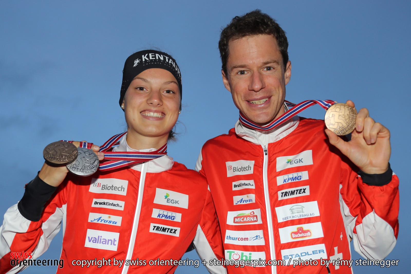SARPSBORG/NORWAY, 16.08.2019 - Simona Aebersold (SUI) Daniel Hubmann (SUI) captured with their medals after the Medal Ceremony Long Distance at the World Orienteering Championships WOC 2019 in Sarpsborg / Norway.