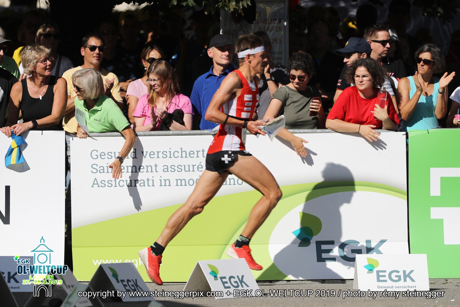 La décision chez les hommes était plus serrée. Yannick Michiels (BEL), spécialiste du sprint, a remporté la course de quatre kilomètres avec un temps de 13:29 minutes et seulement deux secondes d'avance sur Kristian Jones (GBR). Le Suisse Matthias Kyburz a terminé troisième à 14 secondes du vainqueur. C'était la première fois qu'il montait sur le podium d'une course de Coupe du monde cette saison et après une période difficile due à une blessure, le Fricktaler est particulièrement heureux de sa position sur le podium aujourd'hui : « L'ambiance était excellente et devant la foule locale, il est particulièrement agréable d'être sur le podium ». Après un bon départ, il était à la limite physiquement, ce qui lui a fait perdre sa concentration pendant un court instant et commettre quelques incertitudes techniques. Joey Hadorn et Daniel Hubmann se classent cinquième ex-aequo avec 34 secondes de retard. « Bien sûr, j'aurais espéré un peu plus » a dit Hubmann, qui a fait une petite erreur et perdu des secondes précieuses dans cette course extrêmement serrée. Andreas Kyburz et Christoph Meier terminent à égalité en neuvième position.
