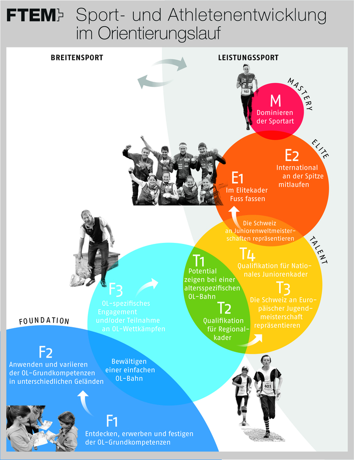 Le concept FTEM spécifique à la course d'orientation définit quelles offres sont disponibles pour les athlètes selon le niveau et quelles sont les activités respectives des associations. F signifie Foundation (fondement, base), T pour Talent, E pour Élite et M pour Mastery (classe mondiale). Chacun de ces domaines clés est à son tour divisé en plusieurs phases. Il s'agit d'un continuum dans lequel les transitions entre les différentes phases sont fluides, et où le sport populaire et le sport de compétition sont tous deux impliqués à part égale. Il montre également comment les connaissances et la technologie pour le sport sont transmises par les entraîneurs et les officiels.