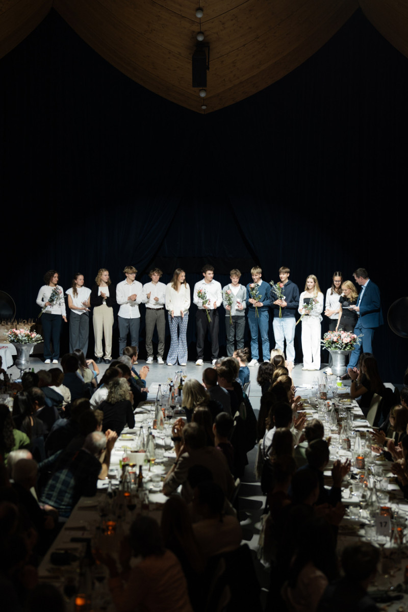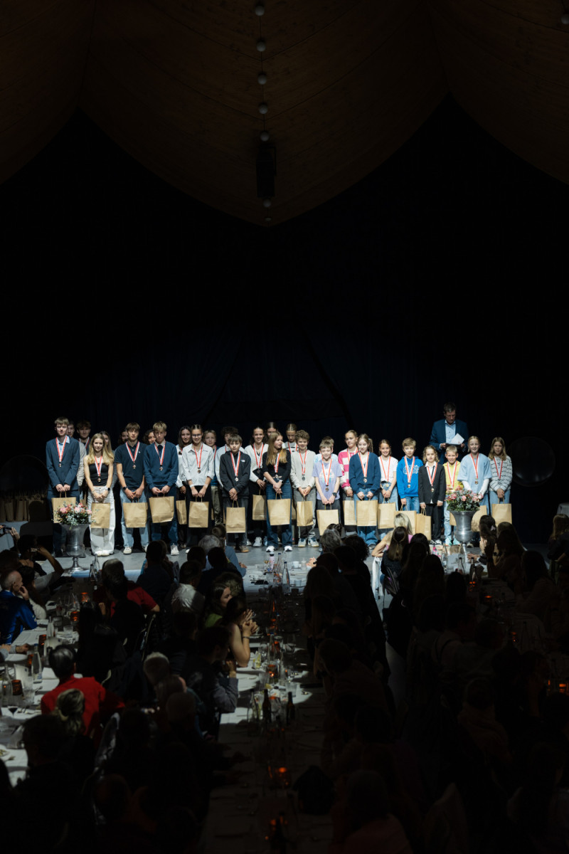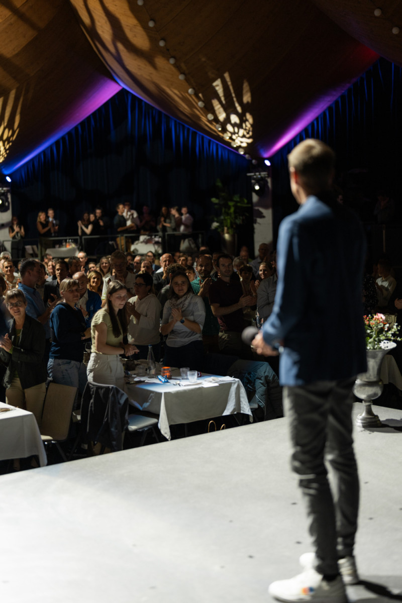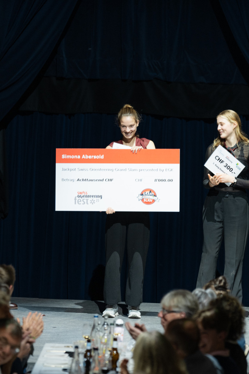 Après un début de soirée sportif et animalier, les portes du chapeau magique se sont ouvertes. Des tables joliment dressées et des lumières scintillantes attendaient les invités de la Swiss O-Fest. Un lieu tout à fait digne pour honorer les nombreuses performances exceptionnelles de cette année : du sport de masse aux succès des jeunes talents en passant par les médailles internationales d'élite. La soirée a été animée par Beat Liechti, tandis que Raphibello et Talpa Hill ont assuré l'animation musicale. Un moment particulier de la soirée a été le départ de Matthias Kyburz. De petits panneaux indiquant le nombre de kilomètres ont accompagné les invités de la fête tout au long de la soirée, jusqu'à ce que Matthias Kyburz soit finalement invité à monter sur scène au kilomètre 42. C'est avec un œil qui rit et un œil qui pleure que la communauté des coureurs d'orientation a fait ses adieux à « Chlai » et l'a remercié par une ovation debout pour toutes les belles émotions qu'elle a pu vivre avec lui.