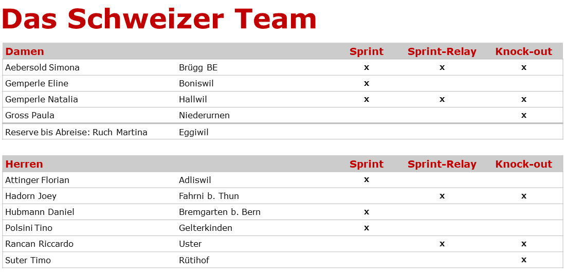 Dopo un giorno di riposo, domenica seguirà la sprint relay nel campus della Heriot-Watt University. Ci saranno squadre miste di quattro persone, con la Svizzera che partirà con la stessa formazione della coppa del mondo di Genova con Natalia Gemperle, Riccardo Rancan, Joey Hadorn e Simona Aebersold.